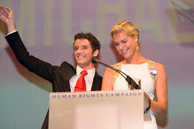 When a group of us protested last year's Washington DC HRC dinner in the wake of the ENDA backstabbing, Monica Helms passed a 'Transgender Pride' button to one of our allies who was going inside the convention center to attend it. That ally promised they would get the button to Rebecca, who along with Michael Urie was there that evening to accept an award on behalf of the show. When they appeared onstage to accept it, Rebecca was wearing the button.