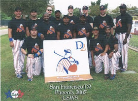 D2 and its members have played in San Francisco area gay softball leagues for several years. During this GWS tournament they got hot, won games and kicked butt all the way to the GWS championship game of their division. D2 discovered during the title game that a (probably a losing) team filed a protest claiming they were in violation of the NAGAAA 'two heteros only' rule. In the interim teams kept interrupting the championship game to the point that D2 lost.