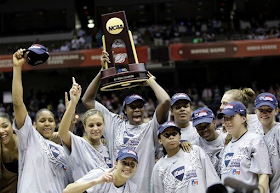 The University of Connecticut Huskies overcame an abysmal first half in which they scored 12 total points and went 10 minutes without scoring to beat the Stanford Cardinal 53-47 at the Alamodome.It was UConn's 78th consecutive win, and they became the first NCAA women's basketball team to win consecutive national championships with an unbeaten record. Interestingly enough, UConn won the 2002 national title game against Oklahoma in San Antonio with a perfect record as well.