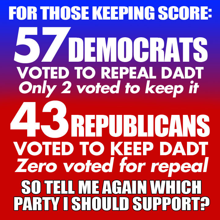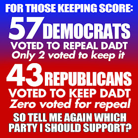 This graphic says it all and can't make it any clearer as to who are the gay community's oppressors.57 Democrats vote for repeal of DADT with 2 voting to keep it. ZERO Republicans vote for repeal of DADT and 43 vote to keep it.
