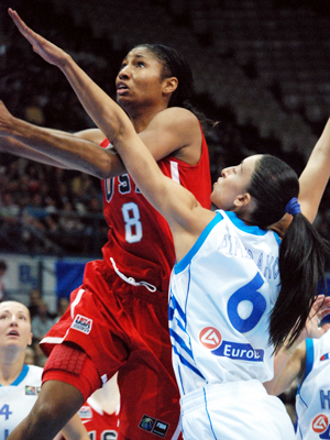 Maya Moore became the third collegiate player in the last twelve years to play on a US FIBA team (Chamique Holdsclaw 1998 and Candace Parker 2006) and helped ignite the 17-6 run that expanded a three point USA lead to 32-18 at the end of the first quarter. That lead grew to a 52-35 at halftime despite Evanthia Maltsi's game high 29 points for Greece.