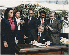 The bill's passage by a veto proof 338 to 90 margin in the House of Representatives and a 78 to 22 margin in the Senate resulted in Reagan signing the bill into law on November 2, 1983.