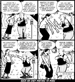 One thing I noticed a long time ago is how similar the anti-trans language and rhetoric is that comes out of the mouths of radical feminists and the religious right. Looks like the cartoonist who drew this noticed the same thing.