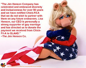 They tried to spin the Henson company pulling their toys from Chick-Fil-A kids meas as the 'toys were defective'. A recent letter that appears to be from the various franchisee owners that seeks to paint the picture they don't share Cathy's agenda has been exposed as a form letter with local details cut and pasted into it. And yeah, Sarah Palin has jumped into this media cacastorm. While campaigning for Tea Klux Klan senate candidate Ted Cruz who '(ugh) won the Republican nomination for the US senate seat about to be vacated due to Sen. Kay Bailey Hutchinson's retirement (R-TX), she and Todd showed up at a Chick-Fil-A store in The Woodlands