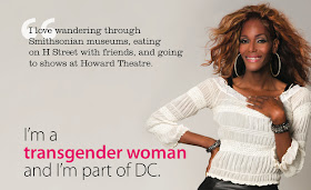 This first of several posters of DC trans and gender variant people who are spokespeople for this campaign were released. The one featuring DC transwoman Kisha quotes her saying, "I love wandering through Smithsonian museums, eating on H Street with friends, and going to shows at Howard Theatre."