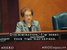 But what we do have is a local remedy to address any discrimination happening in the Houston city limits in 15 categories, and if you faith based oppressors and your kneegrow auxiliaries don't like that because it covers the Houston TBLG community, too bad.H-town discrimination, your time has expired, and I'm glad that my hometown has a human rights ordinance that covers me and all Houstonians.