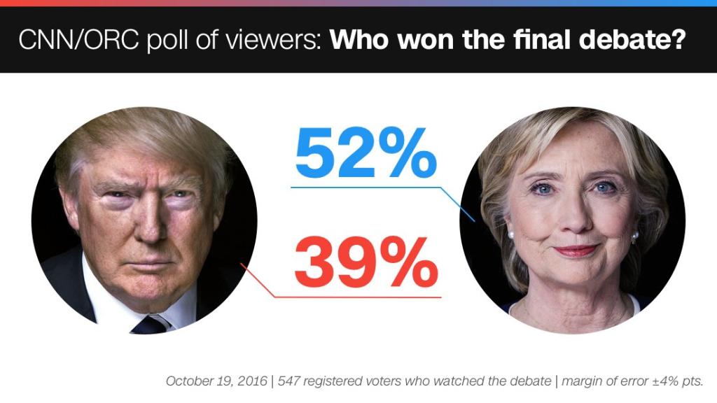 Once again the polls have spoken and backed up what I observed by overwhelmingly stating she won. I agree. Another win for Secretary Clinton