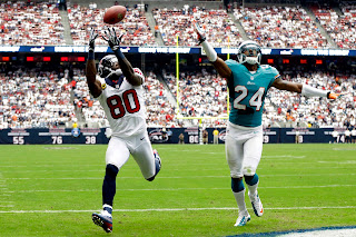 Tannehill handed off on Miami's next play from scrimmage, but that didn't work either because Glover Quin forced a Daniel Thomas fumble which Danieal Manning recovered at the Dolphins 31 with 28 seconds left before halftime. Schaub threw a pinpoint pass to the end zone to Andre Johnson, who made the acrobatic catch over the Dolphin defender for a 24-3 halftime lead.