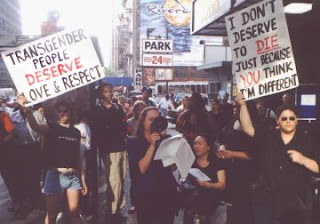 "People refer to us as `it,' `thing' and `that.' They call us he/she. They say, 'What was that?' Being gay is O.K. They are on TV. How many will have to die before they recognize we are not expendable? We are transgenders."