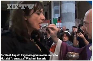 Cardinal Angelo Bagnasco, the Archbishop of Genoa was seen giving Holy Communion during the televised ceremony to two transwomen.  One of the transwomen in question was none other than Vladi Luxuria, who has the distinction of being the first trans parlimentarian in Europe and the second on the planet after New Zealand's Georgina Beyer.   She held that seat until the Italian elections of April 2008.