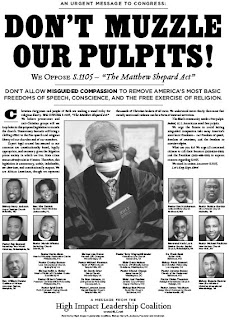 The Congressional Black Caucus is not known as the 'Conscience of the Congress' for nothing. The CBC members and their staffers thankfully saw through the lies that Jackson and his merry band of homohaters were pushing. The homobigots pastors were taking their talking points from James Dobson and asserting that passage of HR 1592, which is now pending in the Senate as the Matthew Shepard Hate Crime Bill would keep them from expressing their First Amendment rights to preach anti-gay sermons and open them up to prosecution.