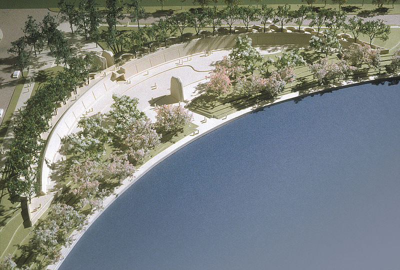 The location is on the northwest corner of the Tidal Basin in a line of sight between the Jefferson Memorial to the southeast and the Lincoln Memorial on the northwest where he gave the August 28, 1963 'I Have A Dream' speech. It is next door to the FDR Memorial and intertwined with the famous cherry blossom trees that ring the Tidal Basin.